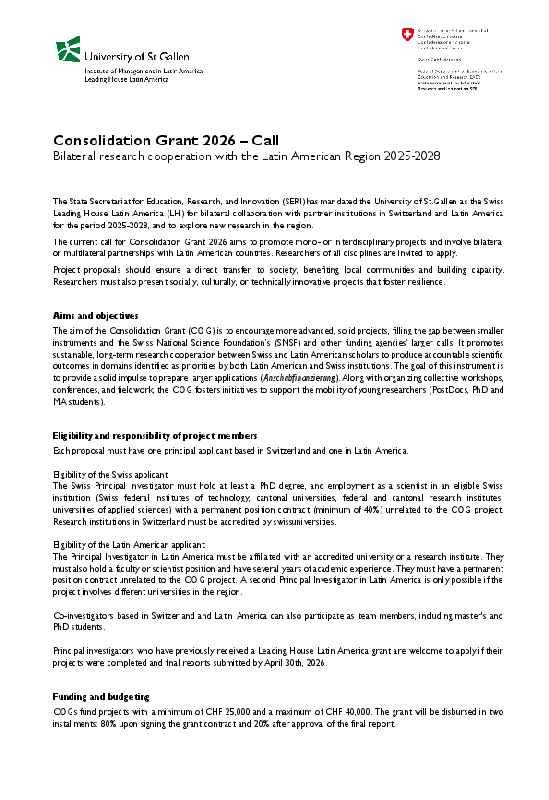 The aim of the Consolidation Grant (COG) is to encourage more advanced, solid projects, filling the gap between smaller instruments and the SNSF's and other funding agencies’ larger calls. It promotes sustainable, long-term research cooperation between Swiss and Latin American scholars to produce accountable scientific outcomes in domains identified as priorities by both Latin American and Swiss institutions. The goal of this instrument is to provide a solid impulse to prepare larger applications (Anschubfinanzierung). In addition to organizing collective workshops, conferences, and fieldwork, the COG fosters initiatives to support the mobility of young researchers (PostDocs, PhD students, and MA students).
