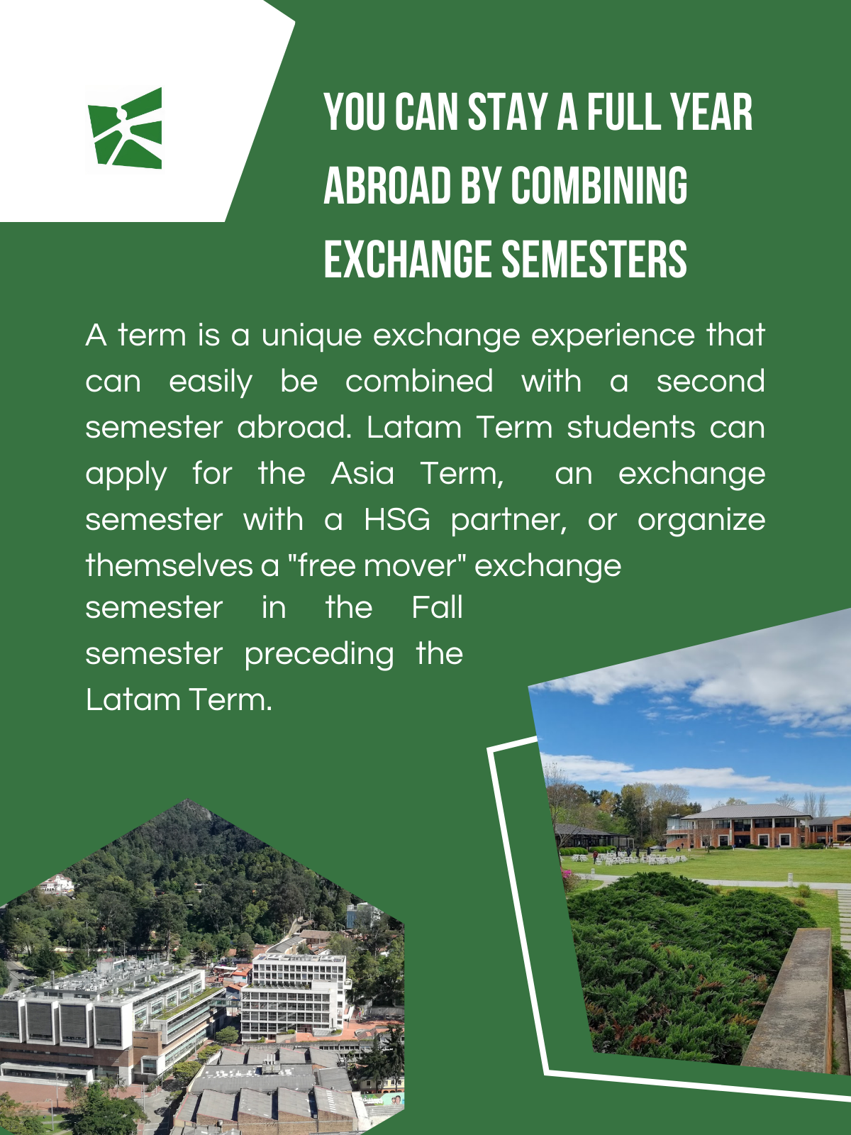 You can also stay an entire year abroad if you consider spending a second semester at another of our partner universities. That is an exclusive option for participants in the HSG Latam Term programme.
