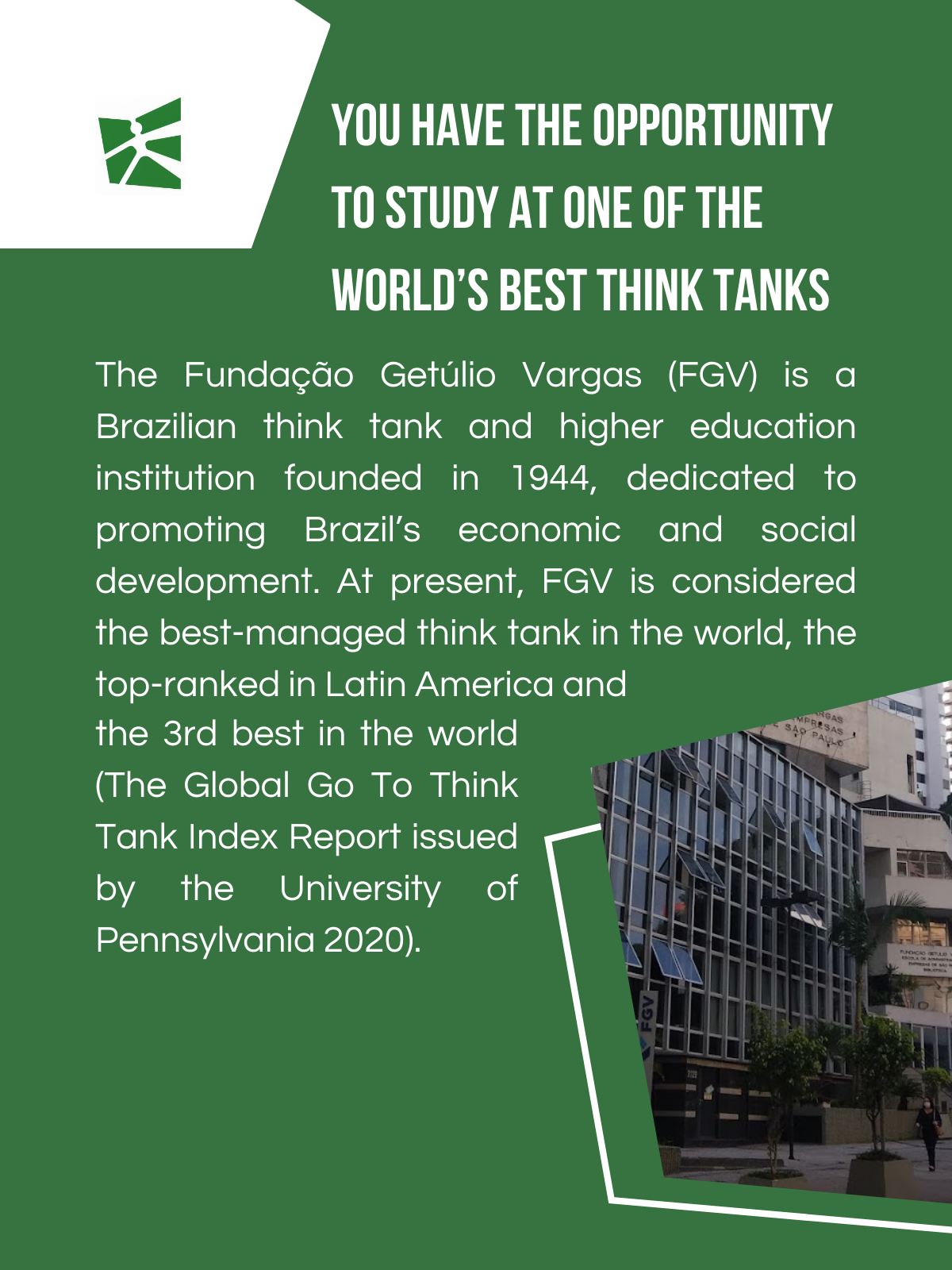 FGV's prominence further elevates the program's credentials. Consistently ranking among the top institutions in Brazil, its undergraduate programs command respect, as reflected in the Brazilian Ministry of Education’s General Course Index (IGC). Additionally, FGV's global stature is underscored by its remarkable presence in the QS Global 200 MBA Rankings, where it stands among the top ten in Latin America. Furthermore, as a leading think tank in the region and a top contender on the global stage, FGV epitomizes excellence in academia and thought leadership.